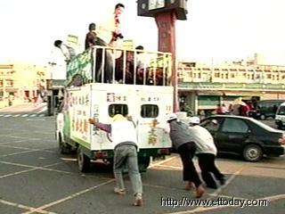 面對(duì)陳水扁與民進(jìn)黨的候選人都已經(jīng)出發(fā),載著隨行記者的小貨車卻無法發(fā)動(dòng),上面的幾個(gè)記者面面相覷,十分尷尬;競(jìng)選總部的幾個(gè)工作人員只得幫忙推車,意外成為了這場(chǎng)輔選的焦點(diǎn)。(趙靜)