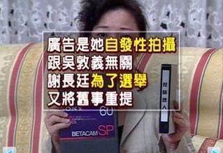 據(jù)報(bào)道,9年前臺(tái)灣高雄市長(zhǎng)選舉期間,島內(nèi)知名藝人白冰冰拍攝廣告,公開批評(píng)謝長(zhǎng)廷“不是人”。這段廣告不但使高雄選情掀起波瀾,還使謝長(zhǎng)廷以此控告當(dāng)時(shí)的競(jìng)爭(zhēng)對(duì)手吳敦義。最后謝長(zhǎng)廷當(dāng)選,吳敦義落敗。當(dāng)年白冰冰就表示,廣告完全是她自發(fā)拍攝的,與吳敦義無關(guān),拍攝廣告主要是因?yàn)橹x長(zhǎng)廷曾為白冰冰女兒被殺案的主嫌辯護(hù)。