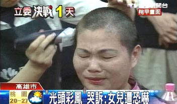 中國(guó)臺(tái)灣網(wǎng)1月11日消息 據(jù)臺(tái)灣TVBS電視臺(tái)報(bào)道,國(guó)民黨“立委”候選人侯彩鳳因?yàn)椴粷M對(duì)手頻頻放出風(fēng)聲,指她買票,在今天做出無(wú)言的抗議,在馬英九及選民面前,剃光頭抗議。