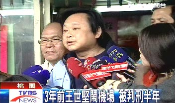王世堅(jiān)在2005年4月26日,趁著連戰(zhàn)訪問大陸,帶大批群眾到桃園國際機(jī)場抗議,今天桃園地方法院作出一審判決,將王世堅(jiān)依妨害“公務(wù)法”和違反“集會游行法”,各判6個月、減刑3個月,兩罪合并刑期為半年。(高大林)
