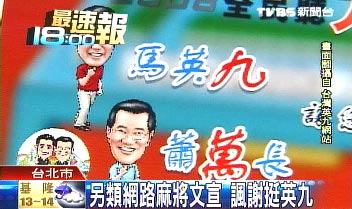 卡通版至尊麻將大賽開打,用知名藝人做代表,這桌麻將的4個咖(角色)還分別代表本省、外省、客家族群以及原住民,影片配音:“聽九萬的啦,聽九萬,俺不要輸(諧音蘇貞昌),聽九萬,我連莊不要停(諧音謝長廷)啊,聽九萬……2008全民聽九萬,馬英九、蕭萬長讓您久等了!”