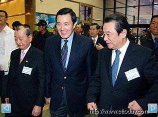 國(guó)民黨2008正副參選人馬英九(中)、蕭萬(wàn)長(zhǎng)23日在出席臺(tái)灣六大工商團(tuán)體主辦的臺(tái)灣經(jīng)濟(jì)發(fā)展論壇座談會(huì)。臺(tái)灣東森新聞?dòng)浾咧旒覐⿺z