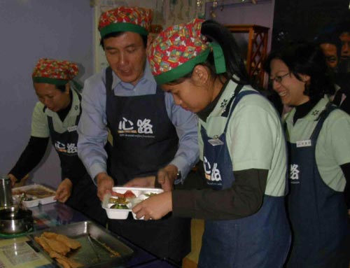 馬英九(左二)穿上圍裙、綁上頭巾包便當(dāng),臺(tái)灣“中廣新聞”溫蘭魁攝