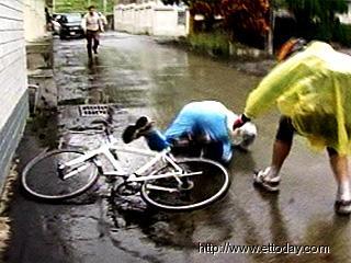 換胎后,杜正勝穿著輕便雨衣繼續(xù)向前行。在一個轉(zhuǎn)彎上坡路段,可能是雨天路滑,杜正勝的腳踏車龍頭不穩(wěn),開始搖搖晃晃,后方的同仁緊急上前試圖幫他穩(wěn)住,但似乎扶不住不斷晃動的單車,杜正勝跌倒在地。