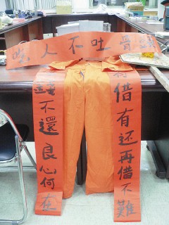 警方經長期搜證后,昨天逮獲林正崇等人,查扣棍棒、電擊棒、油漆等,其中最特別的證物就是一堆寫好的“恐嚇春聯(lián)”。最近因年關臨近,林正崇想出用“恐嚇春聯(lián)”觸人霉頭,不少債務人怕被貼,乖乖還錢。(周先)