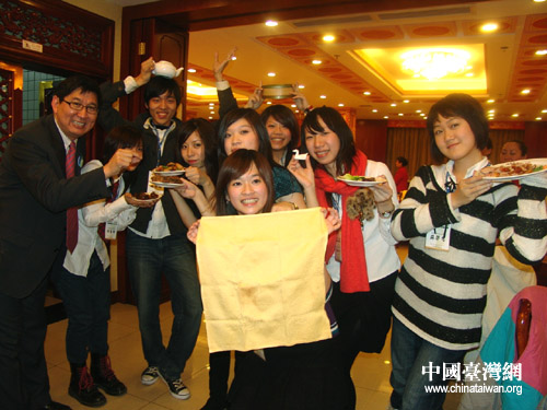 來自臺灣花蓮教育大學(xué)的林鈺堂剛剛結(jié)束哈爾濱的行程來到北京,第一次踏上大陸這片神奇的土地讓他有種說不出的激動!氨本└稍铩⒑溆智逍碌目諝舛甲屛覀兏械叫老,那種感覺很微妙。聞名不如見面,大陸之行不僅讓我們增長了閱歷,更結(jié)交了朋友! 與林鈺堂同校的女孩陳珈蓁對任何事物都感到好奇和驚喜,她興奮地學(xué)習(xí)卷烤鴨的技巧,拉著記者照相,并與新朋友交換聯(lián)系方式,渴望交流與溝通的迫切心情溢于言表。