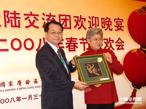 中國宋慶齡基金會副會長唐聞生(右)與交流團(tuán)團(tuán)團(tuán)長臺灣十大杰出青年基金會監(jiān)察人陳建騏先生互換禮品