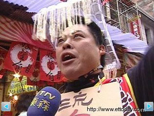 叫賣年貨,魷魚絲帽造型炫口號(hào)響。來源:臺(tái)灣東森新聞