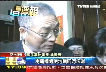 據(jù)臺灣“中央社”報道,美國當(dāng)?shù)貢r間2月3日,國民黨秘書長吳敦義偕同國民黨海外部主任何恩因、國民黨籍新科“立委”李明星出席“洛杉磯臺灣同鄉(xiāng)聯(lián)誼會”的新春賀歲聯(lián)誼茶會。吳敦義表示,這趟洛杉磯行程,是洛杉磯馬蕭后援會用時多日籌備的一場造勢活動,國民黨主席吳伯雄與前主席馬英九都點名他專程參加,為南加州泛藍陣營打氣。