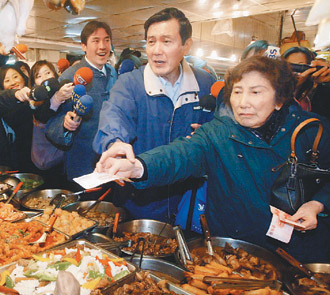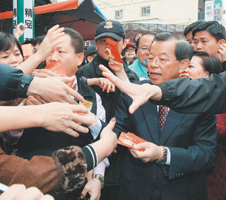 謝長廷昨天到臺中市天津街年貨大街向民眾拜年,并發(fā)送新臺幣10元紅包,一小時內(nèi)發(fā)出3000個。(聯(lián)合報圖)