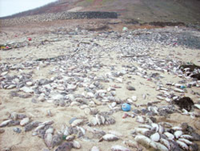 中國臺灣網(wǎng)2月18日消息 四面環(huán)海的澎湖望安離島,連日來四周海灘布滿了魚尸!疤膳铝耍陌俟唛L的海灘全是魚尸!蓖仓袑W(xué)校長洪嬡慧表示出她的驚駭,她說望安有7個海灘,只走了2處海灘,情況都一樣嚴(yán)重。