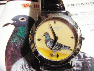 這是瑞士百達翡麗打造的彩繪表,表面上的賽鴿圖案是黃良德飼養(yǎng)的“新世紀”,它曾得過世界越洋冠軍,現(xiàn)已24歲高齡。