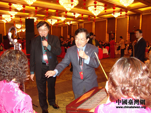 紐約中國和平統(tǒng)一促進(jìn)會會長花俊雄和臺灣中國統(tǒng)一聯(lián)盟主席王津平共同唱起臺灣民謠《綠島小夜曲》和《望春風(fēng)》。(攝影:鐘寶華)