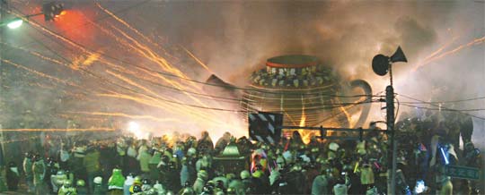 中國(guó)臺(tái)灣網(wǎng)2月22日消息 臺(tái)灣臺(tái)南縣鹽水鎮(zhèn)元宵蜂炮昨晚萬箭齊發(fā),鹽水小鎮(zhèn)像座“被點(diǎn)燃的火藥庫”,神轎隊(duì)伍分三路穿梭鬧街,迎接蜂炮洗禮;逾萬游客有如“置身槍林彈雨”,鹽水鎮(zhèn)愈夜愈熱鬧。