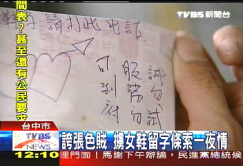 中國臺灣網(wǎng)2月24日消息 據(jù)臺灣TVBS報道,臺中市出現(xiàn)一名變態(tài)竊賊,該竊賊連續(xù)偷走一名女士的鞋子后,還接連留下“索求一夜情換鞋子”的字條。