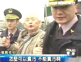 陳水扁在會(huì)上依舊鼓吹推動(dòng)“入聯(lián)公投”,但沒想到臺(tái)下卻有民眾嗆扁,嗆扁民眾隨即被警察帶走;但又有民眾高喊:“阿扁下臺(tái)!”嗆扁老伯念念有詞:“怎么可以貪污,不能貪污!”老伯隨后同樣也被架走。(高大林)