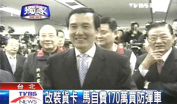 報道稱,上月登記參選時,馬英九搭上臺灣安全單位準備的座車離去,但“僅此一次”,之后馬英九還是搭原來的座車拼選舉。而根據(jù)TVBS掌握的消息,農(nóng)歷春節(jié)前,馬英九悄悄買了一臺TOYOTA皮卡,自費改裝成防彈車。馬英九對此不愿意多談,只是說跟安全有關(guān)。