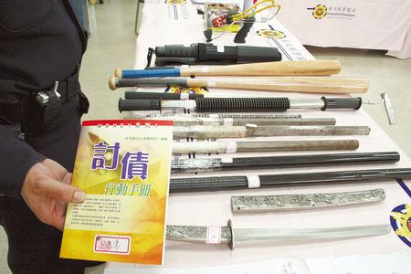 臺(tái)警方破獲暴力討債集團(tuán),逮捕10嫌。討債成員使用球棒、西瓜刀及小武士刀等工具,手上還拿著“討債行動(dòng)手冊(cè)”。。ㄅ_(tái)灣《中國(guó)時(shí)報(bào)》圖片)