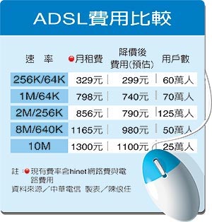 全臺有480萬ADSL寬帶上網(wǎng)家庭用戶,其中420萬戶是此次降價受惠者,中華電信占340萬戶左右。另60萬戶有線電視CABLE上網(wǎng)的使用者不在這次降價范圍內(nèi)。