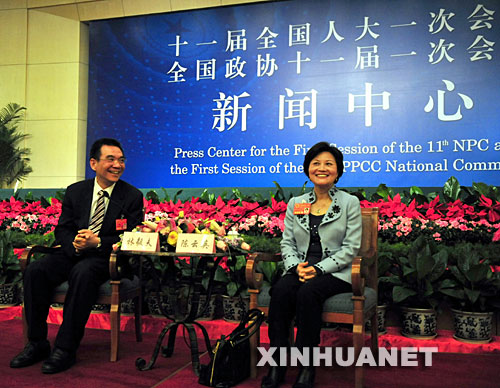 3月7日,全國人大代表林毅夫(左)、陳云英在十一屆全國人大一次會議、全國政協(xié)十一屆一次會議新聞中心共同接受記者采訪。 新華社記者 劉泉龍 攝