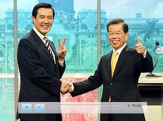 馬英九(左)、謝長廷9日參加第二場電視辯論會,雙方先禮后兵彼此相互握手,還各自比出手勢。來源:臺灣東森新聞