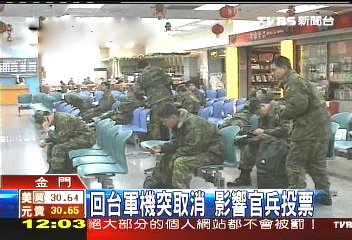 據(jù)臺灣TVBS報道,臺灣軍方在金門每個星期二和五都有專機負責載官兵回臺休假,但從上星期五開始,臺軍方突然宣布停飛,讓200多名原本可以免費搭機返鄉(xiāng)投票的官兵,現(xiàn)在要自掏腰包搭機回臺。