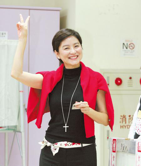 林青霞22日投票后打出“V”的手勢 (臺(tái)灣《中國時(shí)報(bào)》圖片)
