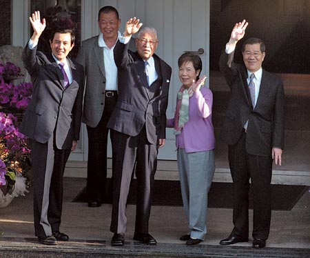 馬英九(左一)與蕭萬長(zhǎng)(右一)前往翠山莊拜會(huì)李登輝(左二),李與夫人曾文惠(右二)親自到門口迎接,四人并向守候的媒體揮手。(臺(tái)灣“中時(shí)電子報(bào)”圖)