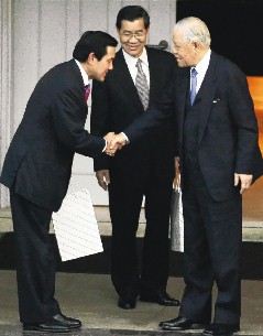 會(huì)后,李登輝親送馬英九、蕭萬長(zhǎng)出門,并再次握起馬的手。(臺(tái)灣《聯(lián)合報(bào)》圖)