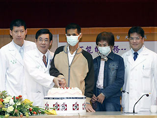 病人陳先生(中)幸運出院,與醫(yī)療團(tuán)隊切蛋糕慶生。(圖:東森新聞)