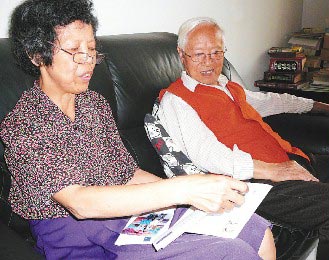 王俊嶸(右)與徐月美(左)夫婦保存著新疆女大學(xué)生唐紅寄來的信,看著她的成績單,兩人十分欣慰。臺(tái)灣《聯(lián)合報(bào)》記者翁禎霞攝