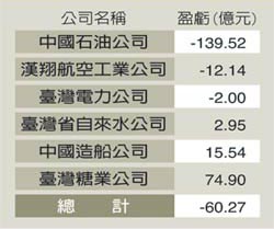 報(bào)道稱,臺(tái)灣“立法院財(cái)政委員會(huì)”昨天審查臺(tái)當(dāng)局2006年度總決算,“審計(jì)長(zhǎng)”林慶隆指出,臺(tái)當(dāng)局“經(jīng)濟(jì)部”主管包括臺(tái)糖、中船、中油、臺(tái)電、漢翔航空、臺(tái)灣省自來水公司等,但其中僅臺(tái)糖、中船、臺(tái)灣省自來水公司賺錢,其余中油、臺(tái)電、漢翔皆為虧損;中油虧損達(dá)139億余元最多,總計(jì)“經(jīng)濟(jì)部”掌理公營(yíng)事業(yè)共虧損60.2億多元。
