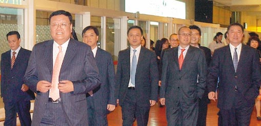 大陸地產(chǎn)富豪訪問團昨(21)日下午抵達桃園機場。圖為訪問團召集人鳳凰衛(wèi)視行政總裁劉長樂(前),帶領訪問團成員雅樂居地產(chǎn)執(zhí)行長陳卓賢(第二排左起)、廣州富力地產(chǎn)董事局主席李思廉、棕櫚泉董事局主席曾偉、北京萬通地產(chǎn)董事局主席馮侖、建業(yè)地產(chǎn)董事長胡葆森等人走進大廳。臺灣《經(jīng)濟日報》記者陳嘉寧攝