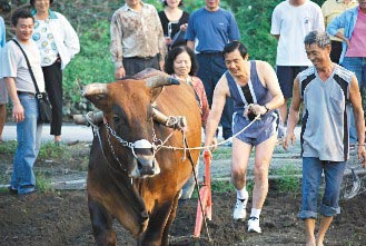馬英九(前右二)曾在下鄉(xiāng)時(shí)向農(nóng)夫許支主(前右)學(xué)犁田,馬希望各“部會(huì)首長”以后也要下鄉(xiāng)長住。臺(tái)灣《聯(lián)合報(bào)》資料照片 范凌嘉攝
