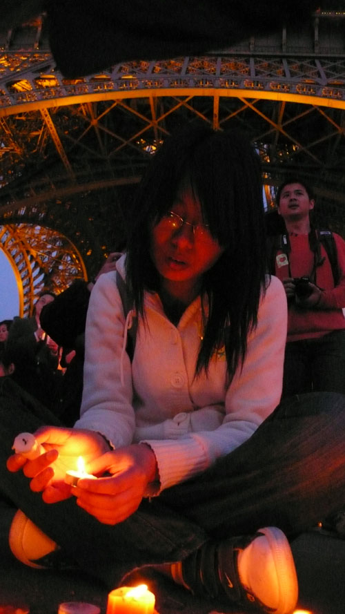 巴黎當?shù)貢r間5月18日晚,兩名小朋友在埃菲爾鐵塔下點燃祈福的蠟燭,為四川的災民祈禱。
