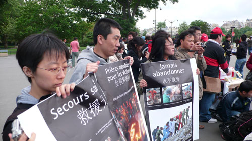 巴黎當?shù)貢r間5月18日晚上,法國華人華僑留學生在埃菲爾鐵塔下舉著海報,向游客展示發(fā)生在中國的地震災難和救援進展。