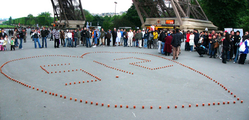 埃菲爾鐵塔下擺好的祈福蠟燭圖案。當天,法國巴黎舉行了千人參加的燭光祈;顒,向四川大地震受害者表達哀思。