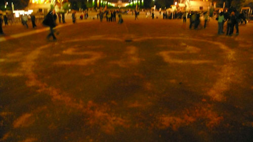 巴黎當?shù)貢r間5月18日晚,埃菲爾鐵塔燭光祈福會結束后,清理現(xiàn)場完畢,地面留下的燭印。