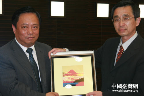 全國臺(tái)聯(lián)會(huì)長(zhǎng)梁國揚(yáng)出席捐款儀式,并和日本神戶中華同文學(xué);Q禮物。(攝影:鐘寶華)
