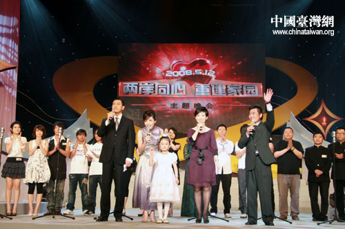 晚會由中央電視臺主持人魯健、王端端及臺灣的何啟圣 、尹乃菁共同主持。以詩朗誦、播放短片等形式,重溫了地震發(fā)生后兩岸同胞發(fā)自肺腑的同胞之愛和骨肉之情。臺灣紅十字醫(yī)療隊積極救助災區(qū)群眾等感人情景通過大屏幕重現(xiàn),深深感動了現(xiàn)場每一位演員和觀眾。兩岸同胞在危難面前同舟共濟的手足摯愛,引發(fā)了一次又一次熱烈的掌聲。