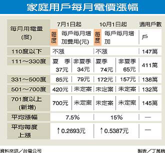 臺(tái)電公司強(qiáng)調(diào),月用電量在330度以內(nèi)用戶,約558萬戶,占全體用戶數(shù)一半,7月起每月電費(fèi)增加35元;10月1日第二次漲價(jià)后電費(fèi)增加68元。累計(jì)兩波漲幅增加每月支出103元。