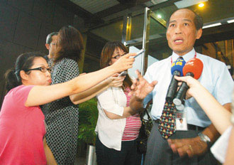 臺灣《中國時報》社長林圣芬(右一)昨天出面證實裁員消息時,時報產(chǎn)業(yè)工會總干事黃惠偵(左一)鼓著腮幫子,心情沉重地在一旁全程錄音。臺灣《聯(lián)合報》記者林俊良攝