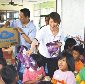 周美青向小朋友發(fā)放小熊玩具及餅干。來源:臺灣《聯(lián)合報》