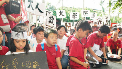 臺南縣總爺小學(xué)廢校案鬧得沸沸揚(yáng)揚(yáng),家長會上月曾帶著學(xué)童到臺當(dāng)局“教育部”下跪陳情。臺灣《聯(lián)合報》資料照片 記者潘俊宏攝