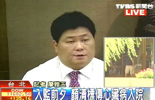 臺北榮總醫(yī)院表示,顏清標在昨天晚上11點時,因為胸口不適和氣喘而送急診,經過檢查之后,發(fā)現是急性心衰竭,在做過診療之后,已經轉到加護病房。