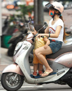 臺灣家長騎著摩托車接送小朋友時,往往會讓小朋友暴露在交通危險中。臺灣《聯(lián)合晚報》圖