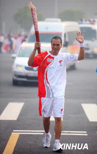 7月25日,臺(tái)商火炬手王尚卿手持火炬?zhèn)鬟f。新華社圖 記者邢廣利攝