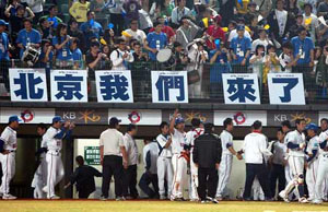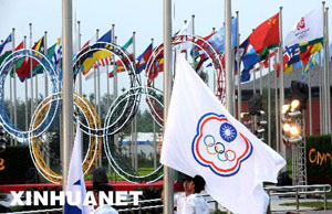 資料圖:(左)3月12日,中華臺北棒球隊以5比0力克澳大利亞,球迷打出“北京,我們來了!”的字幅。(右)8月6日,中華臺北奧運代表團(tuán)在北京奧運村舉行升旗儀式。