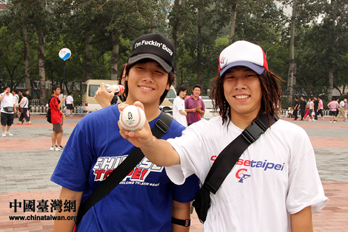 來自臺灣的江同學和呂同學有意外驚喜:接到了擊飛的棒球(攝影 李徽)