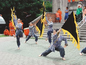 臺灣新竹縣“義民節(jié)”將于8月16日熱鬧登場,新竹客家舞蹈團昨天演出黑旗舞“義民爺”,預(yù)告精彩活動。圖片來源:臺灣《聯(lián)合報》。